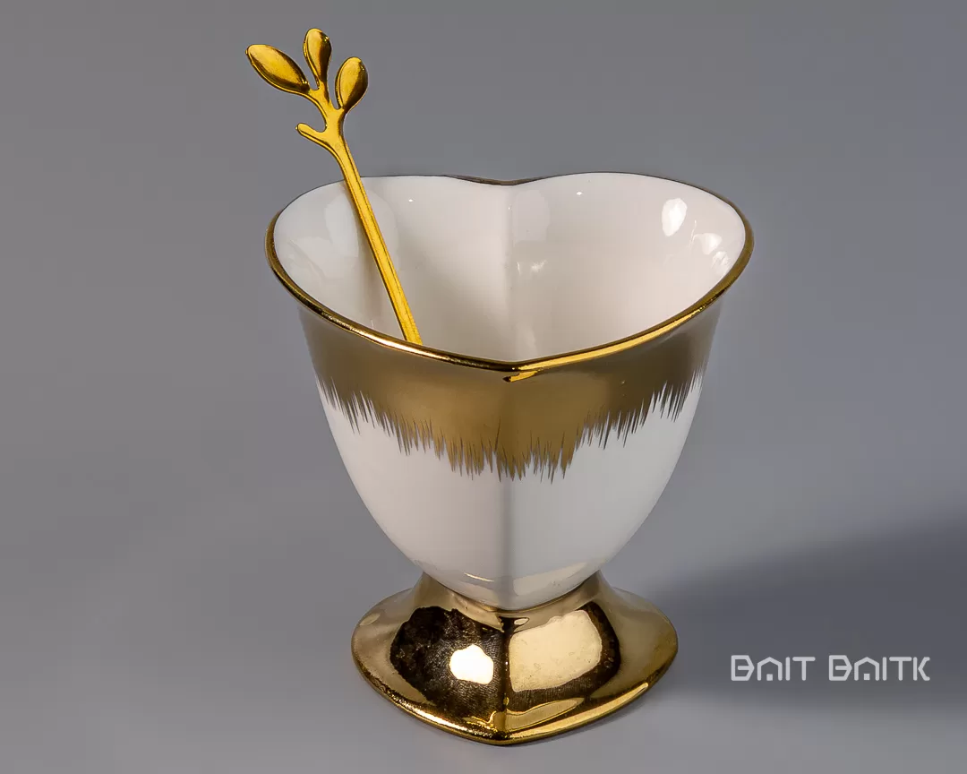 بالإضافة إلى ذلك، تحتوي كل قطعة على ملعقة صغيرة بتصميم غصن ذهبي، وهذا يعطي إحساساً بالتناسق والاهتمام بالتفاصيل.