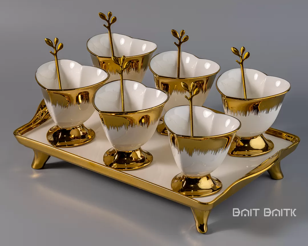 من ناحية أخرى، يناسب هذا طقم تقديم حلى ذهبي مع صينية الجلسات اليومية والزيارات الرسمية على حد سواء.