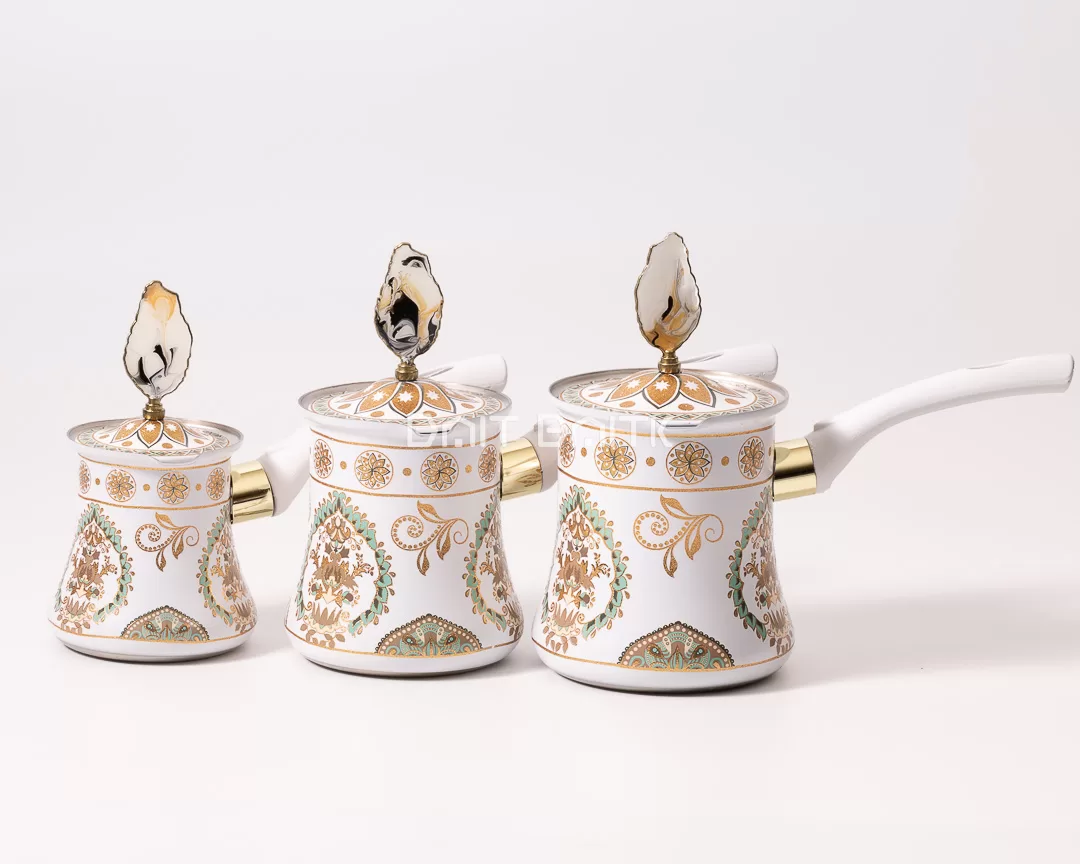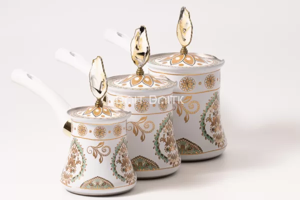 طقم ركوات قهوة تركية فاخرة باللون الأبيض، مكوّن من 3 أحجام مختلفة، مزخرف بالذهبي والتركواز مع أغطية ديكورية ومقابض مريحة. مثالي لركن القهوة وتحضير القهوة التركية أو العربية وتقديمها بضيافة أنيقة في البيت.