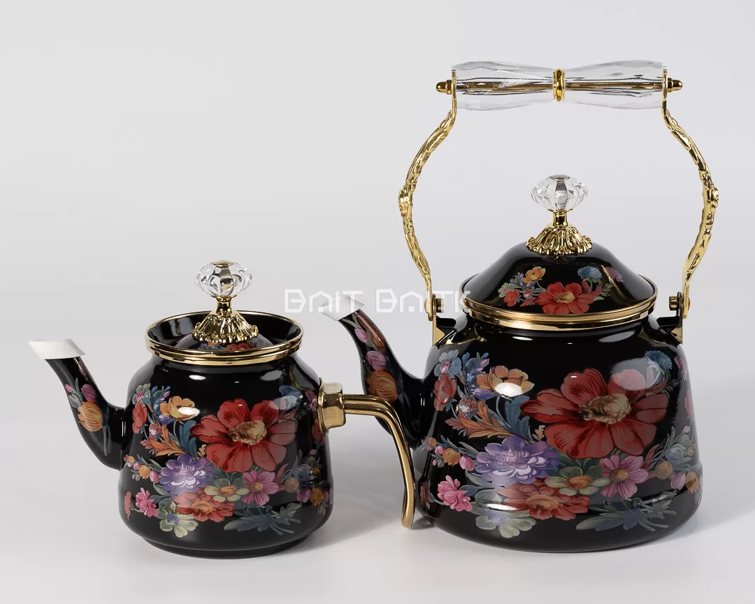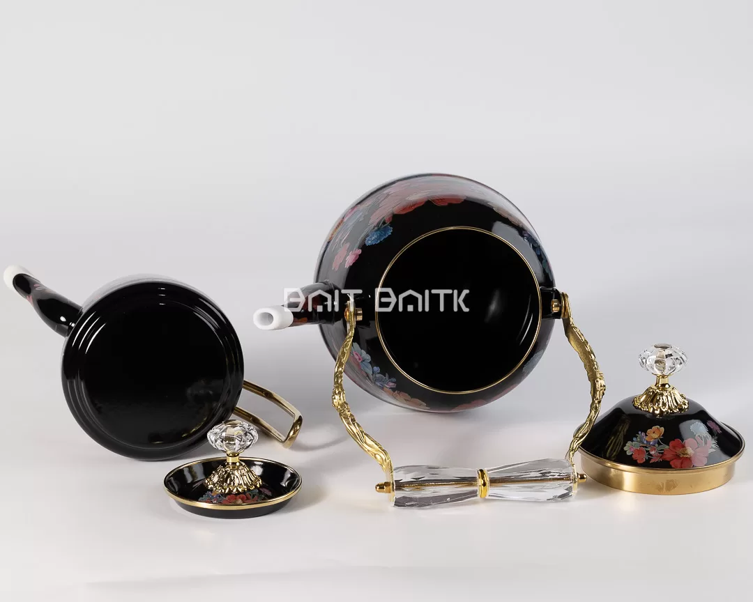 إذا بدّك طقم شاي “فخم” يلفت النظر على الطاولة، هيدا الطقم الأسود المزهر هو خيار ممتاز. أولًا، اللون الأسود اللامع مع رسومات الزهور الغنية بيعطي حضور قوي وراقي. بالإضافة إلى ذلك، اللمسات الذهبية والقبضة الشفافة بتزيده فخامة، وبالتالي بيكون مناسب للبيت وللعزومات.