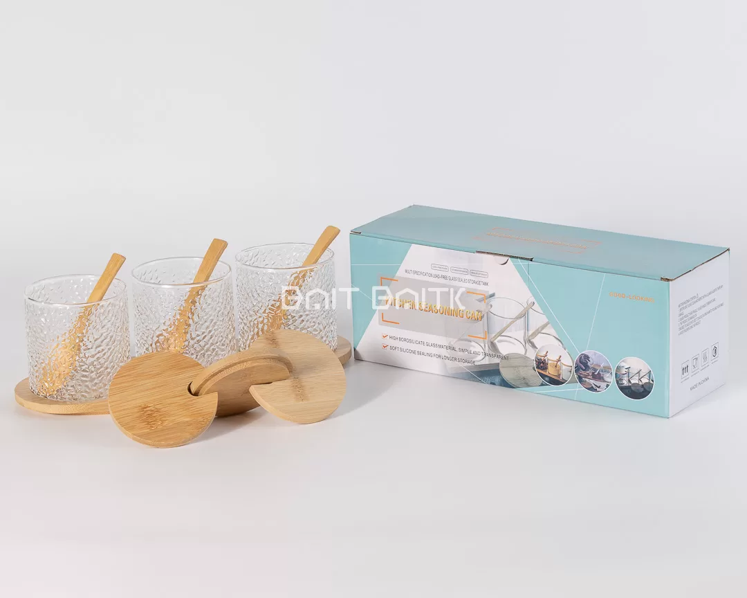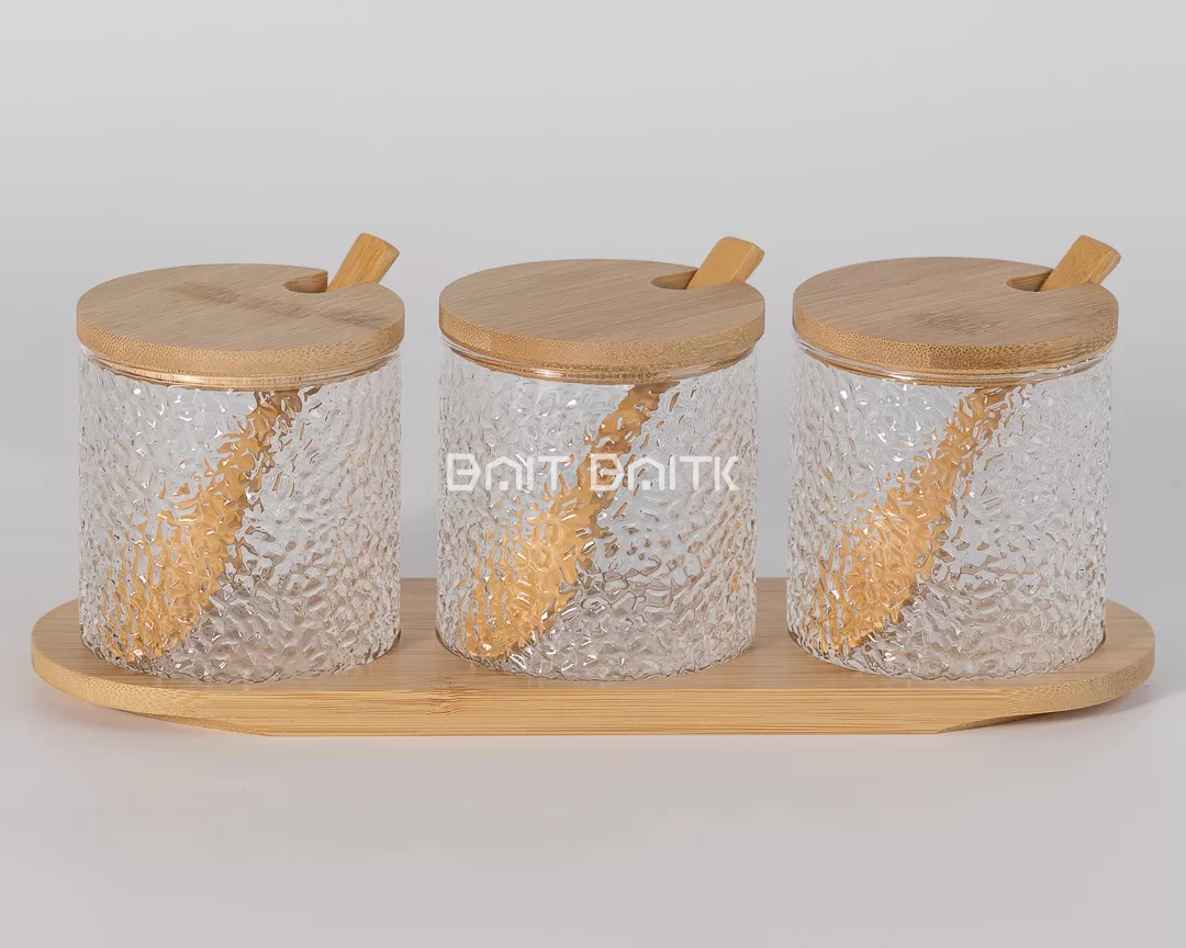 A neat and stylish set for your kitchen and hosting: 3 glass bowls with bamboo lids and 3 bamboo spoons, plus a bamboo wooden tray to keep everything organized on your counter or table. Ideal for sugar, coffee, tea, and light spices.