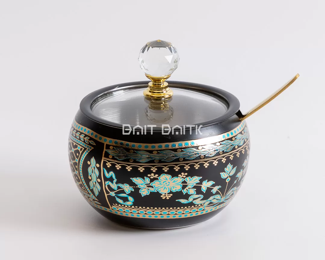 Add a luxurious and artistic touch to your serving table with this black decorative sugar jar. The golden and turquoise engraved details create a sophisticated and timeless design.
