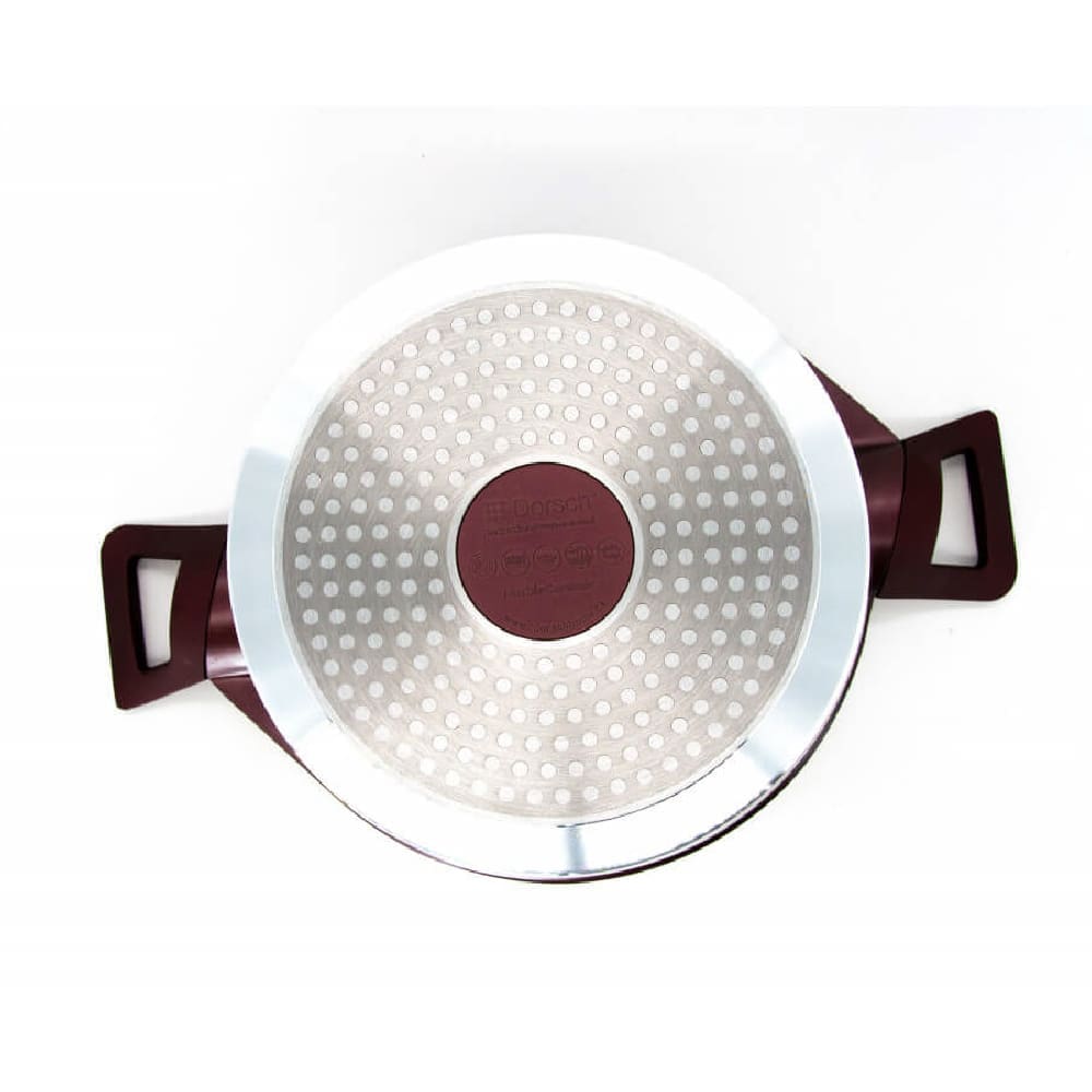 The Dorsch Premium casserole is designed for home cooks who want both style and reliable performance in one pot. Firstly, its deep shape and wide opening make it perfect for everyday dishes such as stews, rice, soups and pasta. In addition, the burgundy exterior gives a modern look on the stove and on the table, while the light speckled interior makes it easier to see your food as it cooks.
