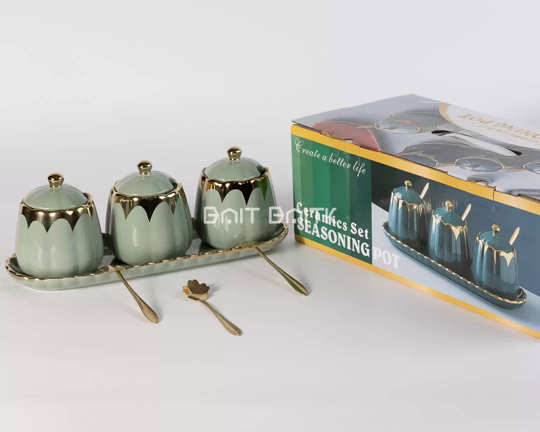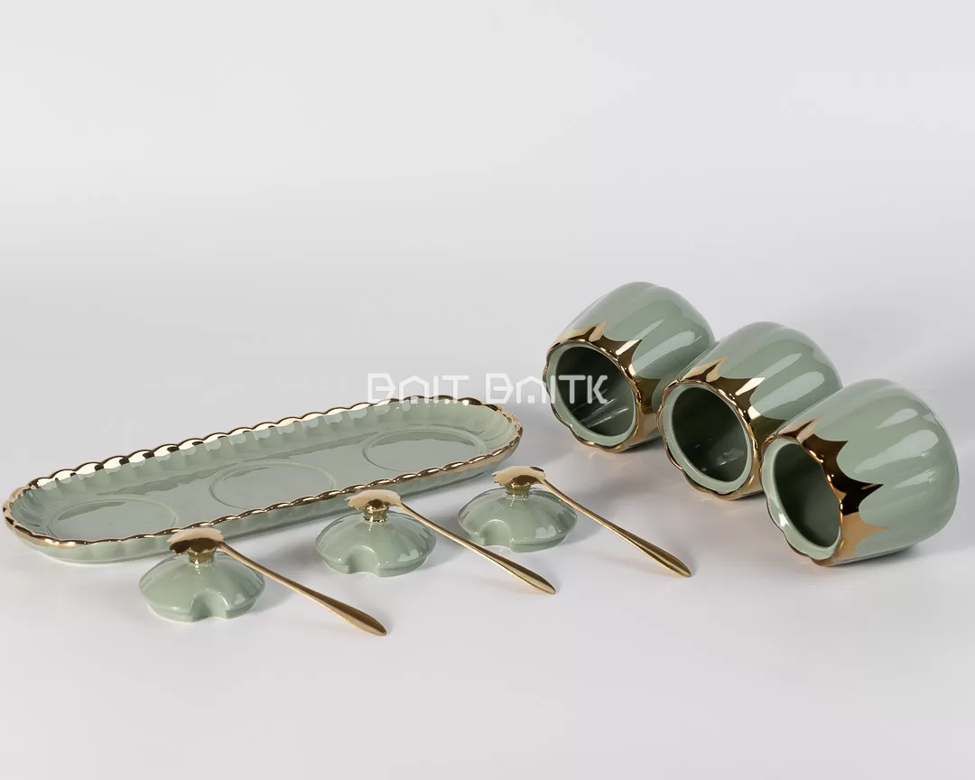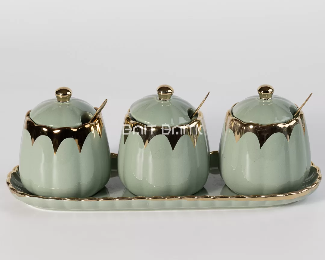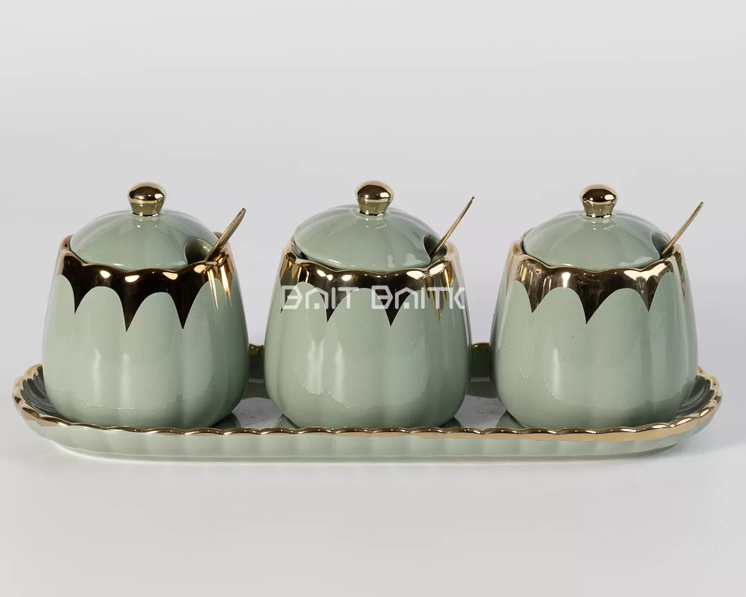 An elegant serving set that keeps your countertop neat: 3 ceramic pots with lids and spoons on a long ceramic tray. The soft Sage Green color with gold accents adds a premium touch to coffee tables and daily kitchen use.