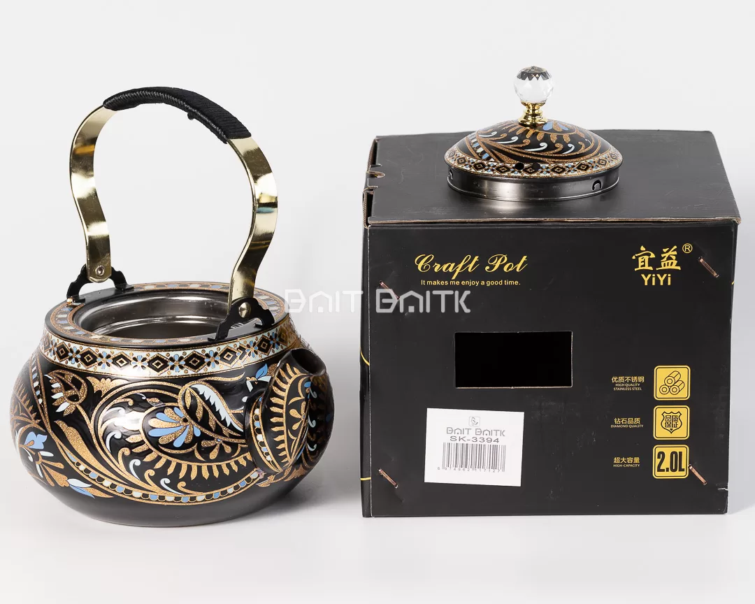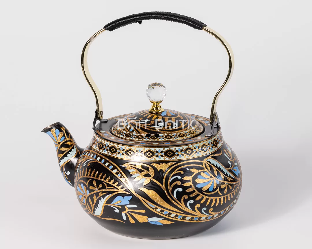 Elegant decorative tea pot in black with gold & blue accents, 2L capacity and a stainless-steel interior for clean taste and easy cleaning. Perfect for hospitality and daily serving.