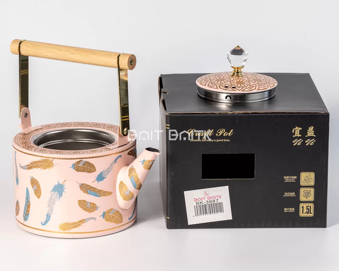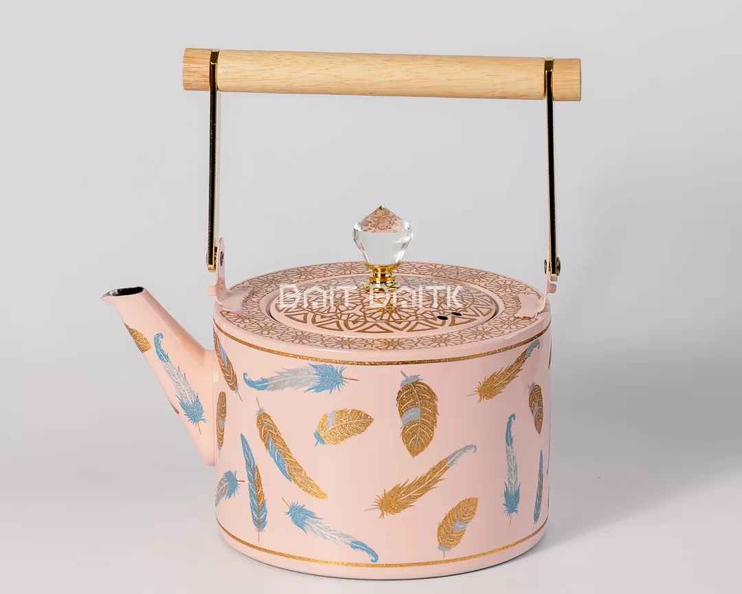 Add a soft, stylish touch to your tea table with this elegant pink tea pot featuring feather prints and refined gold accents. Designed to stand out in hospitality settings, it combines a beautiful decorative exterior with a practical stainless steel interior. The crystal-style knob and wooden handle bar give it a premium, gift-worthy finish.
