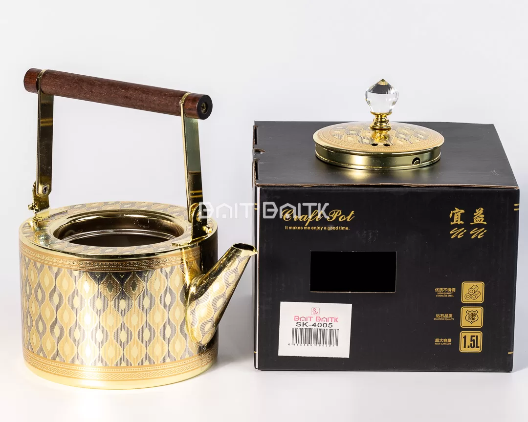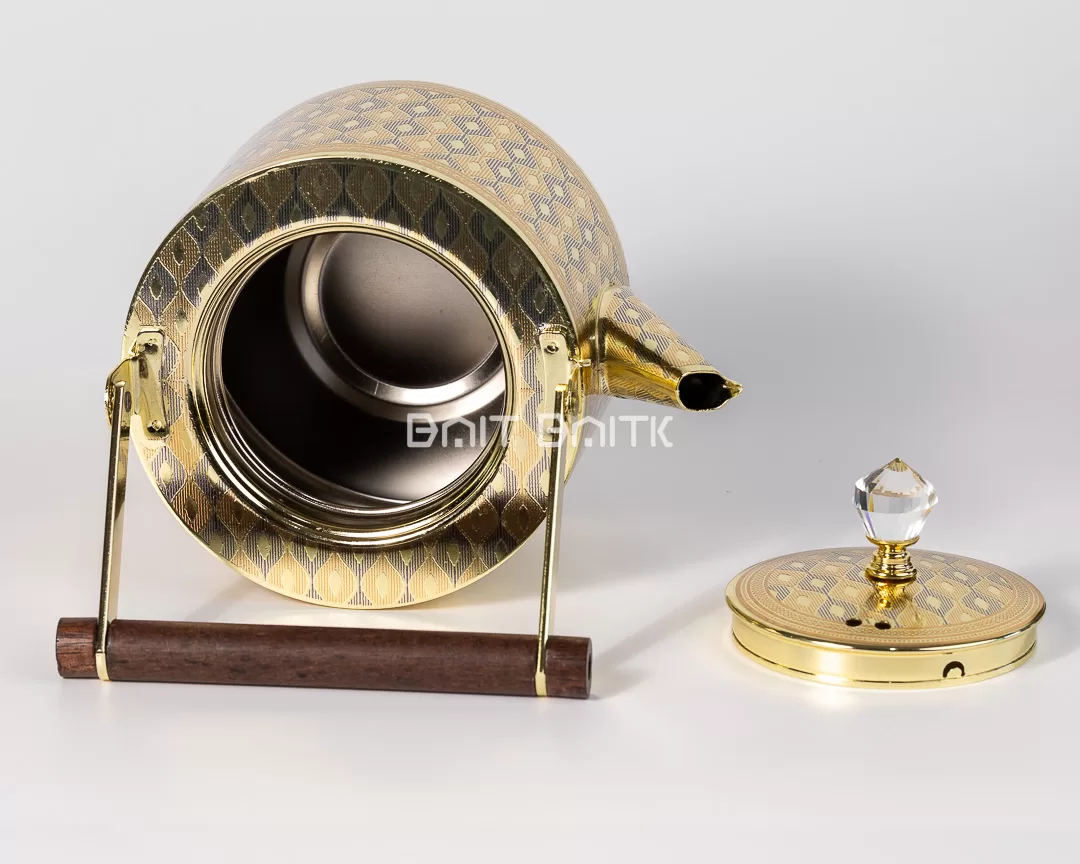 Elevate your tea table with this luxurious gold tea pot featuring a refined geometric pattern and a premium glossy finish. Built for both style and practicality, it comes with a stainless steel interior and a crystal-style knob. The dark wooden handle bar adds a classic, upscale touch—making it perfect for serving tea/coffee and gifting.