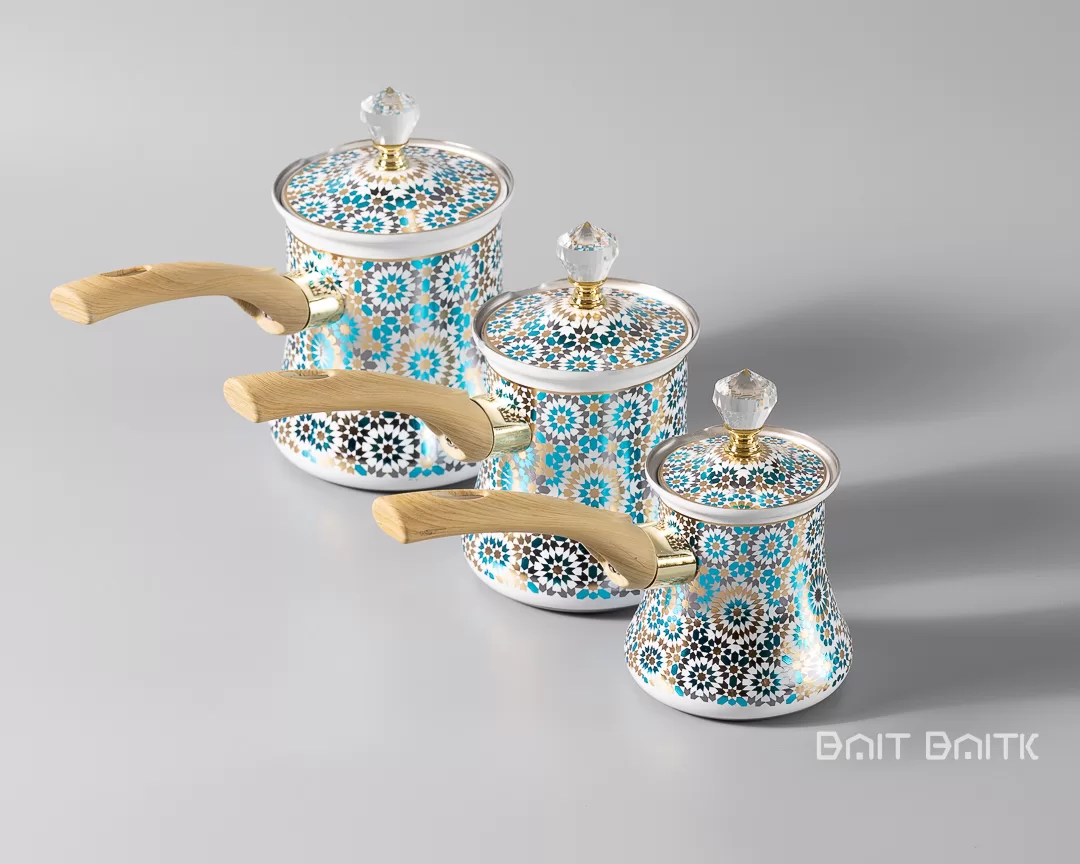 The Moroccan blue Turkish coffee pot set adds colour and elegance to your coffee corner. The three enamel-coated pots feature a mosaic pattern with turquoise, black and gold details inspired by traditional Moroccan art.